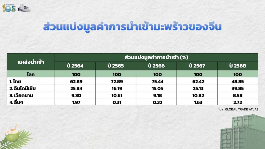 2.2) ภาคผลสดส่งออก แบ่งออกเป็น 2 ด้าน คือ โรงงานของคนไทยที่มีมาตรฐานสากล *ต้องแบกภาระต้นทุนที่สูงกว่าในการปฏิบัติตามกฎหมายโรงงาน ทั้งภาษี การทำมาตรฐานสากลต่างๆ ด้านคุณภาพและความปลอดภัยมาตรฐานอาหาร *ลูกค้าต่างชาติชะลอการสั่งซื้อสินค้า *สูญเสียตลาดส่งออกมะพร้าวน้ำหอมให้กับประเทศอื่น เนื่องจากมีราคาที่ถูกกว่าและมีความผันผวนของราคาที่ต่ำกว่าไทย (จีนเป็นตลาดส่งออกที่มีมูลค่าถึงร้อยละ 80 ของมูลค่าการส่งออกทั้งหมด ซึ่งในปี 2566 ไทยเคยครองส่วนแบ่งถึงร้อยละ 75 แต่ปี 2568 ส่วนแบ่งตลาดลดลงเหลือเพียงร้อยละ 48) *ผู้ผลิต/ผู้ส่งออกไทย ผันตัวมาเป็นผู้รับจ้างผลิตให้กับบริษัทต่างชาติที่เป็นผู้กำหนดราคารับซื้อ/ขาย และ โรงงานของทุนต่างชาติหรือนอมินี *มีการลงทุนที่ครบวงจรตั้งแต่ การเช่าเหมาสวน โรงผลิต โรงบรรจุภัณฑ์ การขนส่ง-ส่งออก มีช่องทางจัดจำหน่ายเอง ทำให้เป็นผู้ซื้อรายใหญ่ที่ควบคุมราคารับซื้อ/ขายได้หมด และกำหนดเกณฑ์รับซื้อเฉพาะมะพร้าวน้ำหอมเกรดดีเท่านั้น *มีต้นทุนที่ต่ำกว่า จากการไม่ปฏิบัติตามกฎหมาย (บางแห่ง) หรือไม่ได้มีการทำระบบมาตรฐานเต็มรูปแบบ *แสดงบัญชีขาดทุนในไทยแต่กำไรปลายทางอยู่ต่างประเทศ *รัฐบาลของนักลงทุนต่างชาตินั้นส่งเสริมการลงทุน ช่วยเรื่องภาษีในการนำเข้าสินค้าจากบริษัทต่างชาติของตนเองในไทย