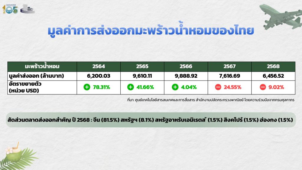 2.1) ภาคการเกษตร ในประเทศมีการขยายพื้นที่ปลูกมะพร้าวน้ำหอมพร้อมกันหลายพื้นที่ จาก 235,903 ไร่ ในปี 2564 เป็น 305,706 ไร่ ในปี 2568 และเมื่อผลผลิตออกพร้อมกัน ทำให้ผลผลิตล้นตลาด (532,942 ตัน ในปี 2564 เป็น877,681 ตัน ในปี 2568 โดยเฉพาะปี 2568 เพิ่มขึ้นถึง 49.80%) ในทางกลับกันมูลค่าการส่งออกจากปี 2566 สูงถึง 9,888.92 ล้านบาท ลดลงต่อเนื่อง 2 ปีติดต่อกัน โดยในปี 2568 เหลือเพียง 6,456.52 ล้านบาท ซึ่งเมื่ออุปทานมากกว่าอุปสงค์ เป็นเหตุให้ราคาตกต่ำ และส่งผลให้เกษตรกรมีรายได้ลดลงมากไม่เพียงพอกับค่าใช้จ่าย ไม่มีทุนที่จะต่อยอดบำรุงต้นมะพร้าว ผลผลิตที่ได้จึงมีคุณภาพต่ำ