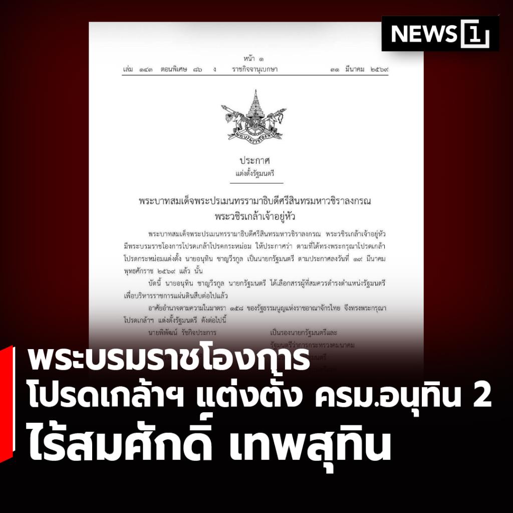 พระบาทสมเด็จพระปรเมนทรรามาธิบดีศรีสินทรมหาวชิราลงกรณ พระวชิรเกล้าเจ้าอยู่หัว มีพระบรมราชโองการโปรดเกล้าฯ ให้ประกาศว่า ตามที่ได้ทรงพระกรุณาโปรดเกล้าโปรดกระหม่อมแต่งตั้ง นายอนุทิน ชาญวีรกูล เป็นนายกรัฐมนตรี ตามประกาศลงวันที่ 19 มีนาคม พุทธศักราช 2569 แล้วนั้น