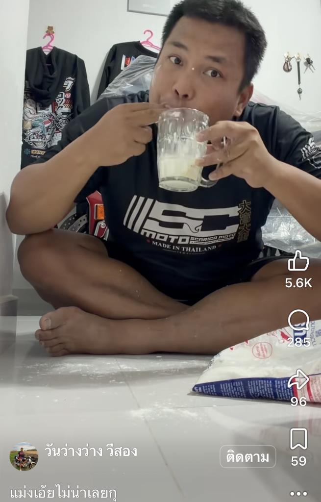 เพื่อเป็นการยืนยัน เจ้าตัวได้ทำการผสมผงสีขาวจากถุงดังกล่าวลงในแก้วน้ำแล้ว “ดื่มโชว์” ต่อหน้ากล้อง พร้อมทิ้งท้ายด้วยประโยคสุดแซ่บว่า "ผมมีวุฒิภาวะพอ มันคือคอนเทนต์ครับ "เข้าใจว่าพวกนักข่าวมาเอาแสงจากผม ผมรู้เท่าไม่ถึงการณ์แล้วกัน"