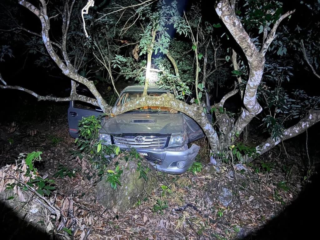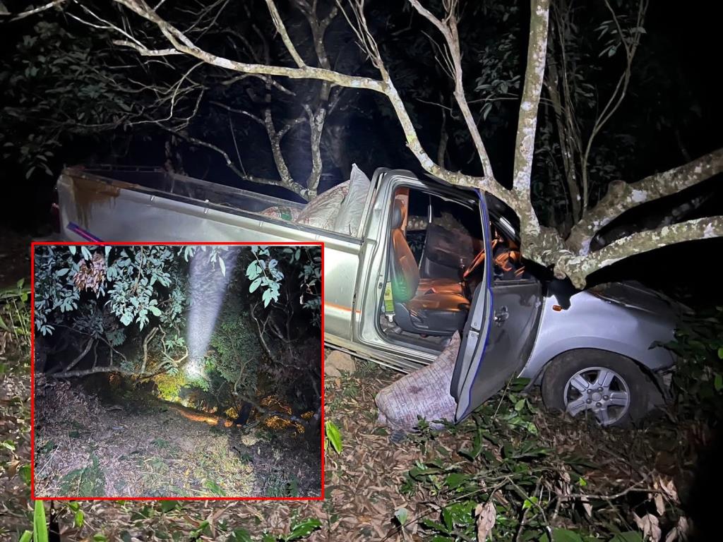 พะเยา - เกิดอุบัติเหตุอุทาหรณ์..กระบะหัวเดี่ยวบรรทุกของลงดอยพะเยาทั้งโค้งทั้งชันกลางดึก เสียหลักหลุดขอบทางพุ่งตกเขาลึกร่วม 50 เมตร ชนคาหินก้อนใหญ่-ต้นไม้ ก่อนทะลุลงไปถึงเชิงเขา โชคดี 2 ชีวิตในรถแค่เจ็บ