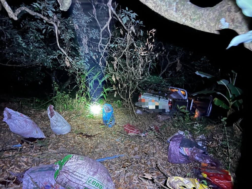 เมื่อเจ้าหน้าที่เดินทางถึงจุดเกิดเหตุ พบรถกระบะ ยี่ห้อโตโยต้า ทะเบียน ผก 1721 เชียงราย บรรทุกของมาหลายกระสอบ เสียหลักพุ่งตกลงไปในเหวข้างทาง ความลึกประมาณ 50 เมตร โดยรถไถลไปหยุดอยู่ท่ามกลางป่ารกและต้นไม้ใหญ่ ข้าวของที่บรรทุกมา ทั้งกระสอบปุ๋ยและสัมภาระต่างๆ กระจัดกระจายเกลื่อนทั่วบริเวณ สภาพรถพังเสียหายบริเวณด้านหน้าและด้านท้าย
