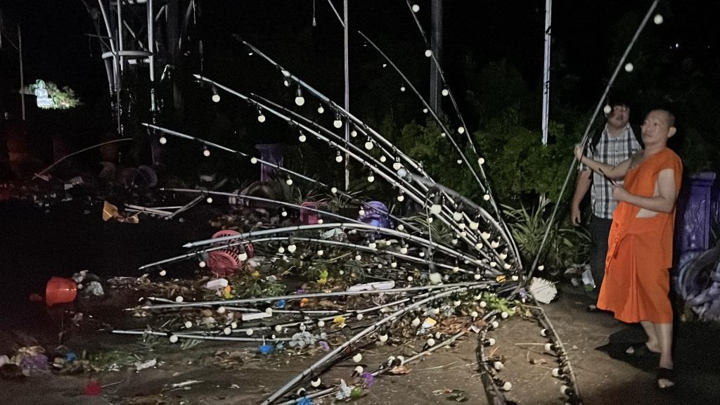เชียงราย – แม่สาย-แม่ลาว เชียงราย เสียหายยับ..โดนพายุฤดูร้อนกระหน่ำตั้งแต่ค่ำ-กลางดึก แรงลมซัดยอดฉัตรวัดพระธรตุดอยเวา หัก-ร่วงกระแทกพื้น ข้าวของภายในวัดปลิตตกแตกกระจายเกลื่อนเสียหายนับล้าน ขณะที่เสาวิทยุสื่อสารมูลนิธิฯล้ม ต้นไม้กิ่งไม้หักทับร้านค้า-ถนนหนทาง ระนาว